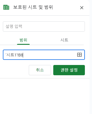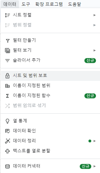 1. [데이터] 창 -> 시트 및 범위보호 클릭
